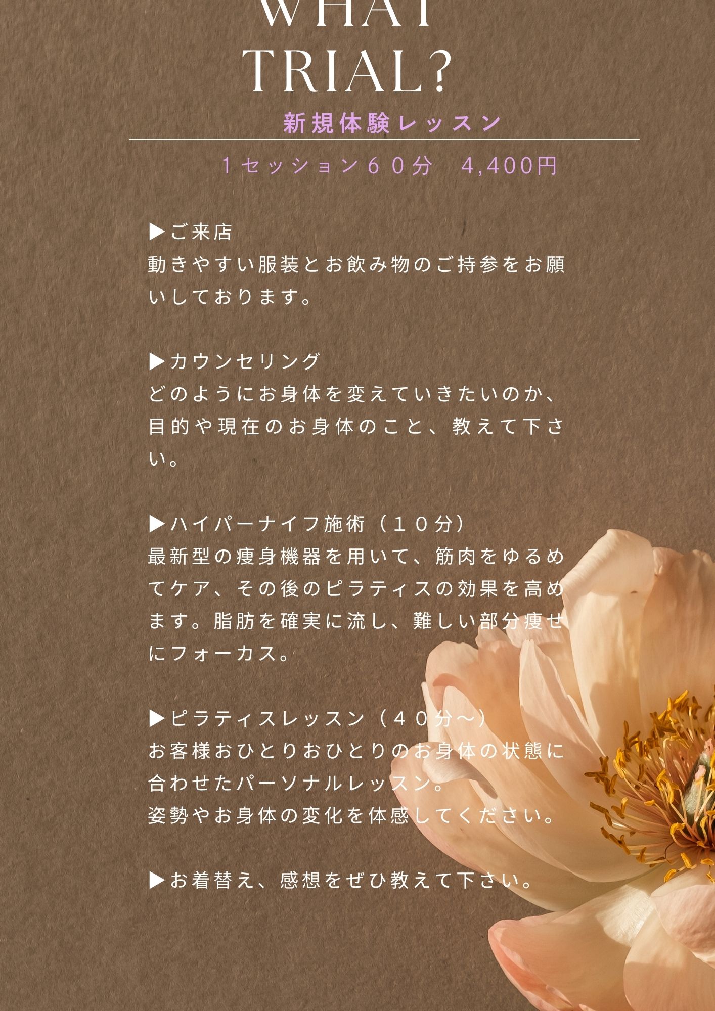 ハイパーナイフにより、その後のピラティスの効果を高めることと、さまざまなプラスの効果がございますので、パスすることも可能ですがぜひ一度ご体感ください。ハイパーナイフ詳しくは各メニューについてのページをご覧ください。(生理中も可能です)